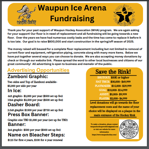 As always, the Waupun Youth Hockey Association thanks you for your support! We are a nonprofit organization that has 501(c)3 status.